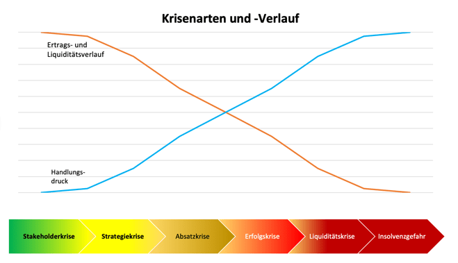Ist ein Unternehmen in eine Krise geraten, ist schnelles Handeln geboten, denn der Zeitpunkt einer einsetzenden Sanierung bestimmt die Optionen, wobei Sanierung die Heilung der Krisenfaktoren bedeutet. Ist die Krise bereits mit Liquiditätsproblemen behaftet (s. Abbildung), befindet man sich schon im finalen Stadium und eine Insolvenz steht kurz bevor bzw. die Insolvenzreife (Zahlungsunfähigkeit und/oder Überschuldung) ist bereits erreicht (gerichtliche Sanierung). Dies sollte unbedingt vermieden werden, da der Druck auf alle Beteiligten dann enorm groß ist und bei Gang in die Insolvenz ggf. die Steuerung der Sanierung nicht mehr in der eigenen Hand liegt.